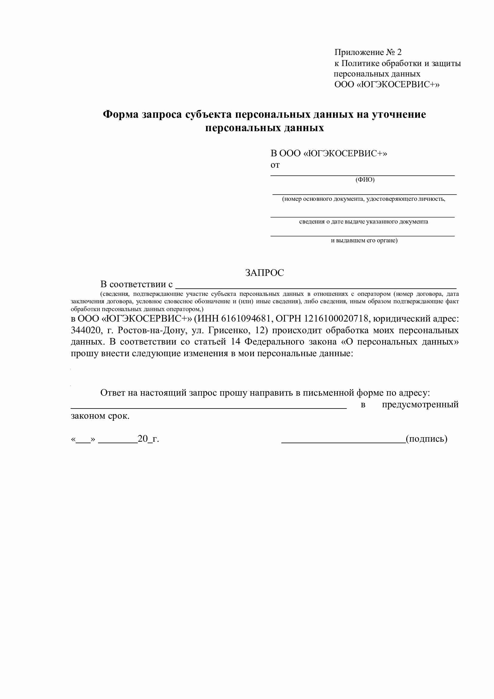 6.9. Для уточнения определенных персональных данных Субъекту (либо законному представителю) необходимо заполнить соответствующую форму запроса субъекта персональных данных на уточнение персональных данных (приложение 2 или 6) и передать лично работникам ООО «ЮГЭКОСЕРВИС+», принимающим обращения граждан, либо по почте.