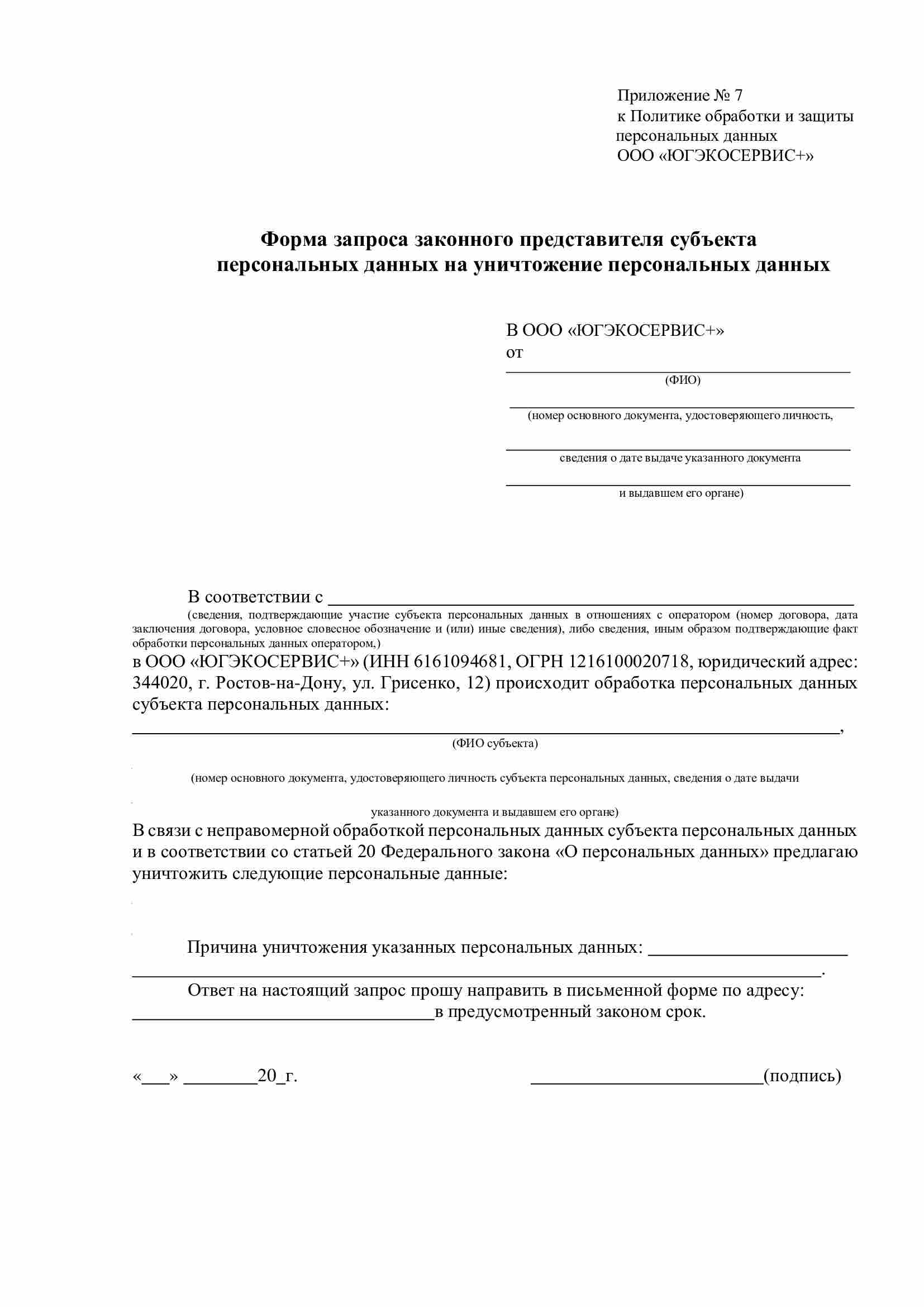 6.10. Для исключения неправомерности обработки персональных данных Субъекту (либо законному представителю) необходимо заполнить соответствующую форму запроса субъекта персональных данных на уничтожение персональных данных (приложение 3 или 7) и передать лично работникам ООО «ЮГЭКОСЕРВИС+», принимающим обращения граждан, либо по почте.